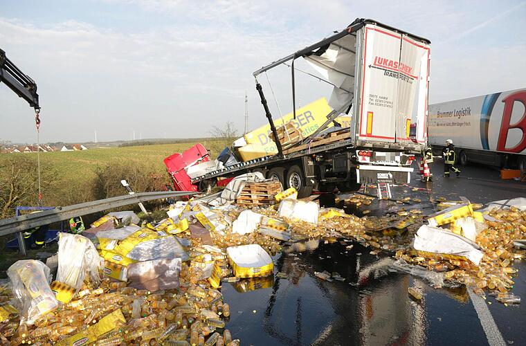 Zwischen Höchstadt und Pommersfelden sind in der Nacht auf Dienstag (5. April) drei Lkw aufeinander geprallt. Dabei wurden die Fahrzeuge beschädigt, die Fahrer blieben unverletzt. Auf der Fahrbahn verteilte sich die Ladung, 23 Tonnen Speiseöl. Foto: Ferdinand Merzbach