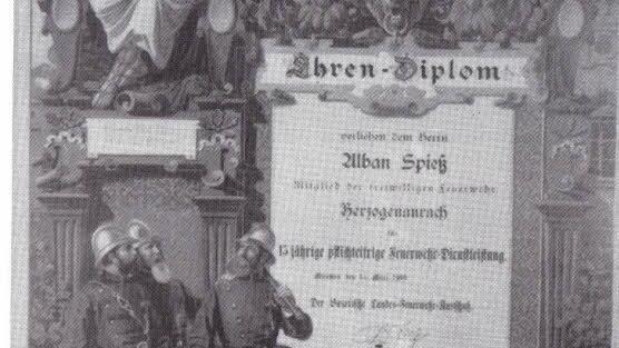Scheinbar kam er aber nur bis nach Herzogenaurach, denn bereits am 15. März im Jahr 1900 wurde ihm für "15 Jahre pflichteifrige Feuerwehr Dienstleistung" bei der Freiwilligen Feuerwehr Herzogenaurach ein vom Bayerischen Landes-Feuerwehrausschuss ausgestelltes Ehrendiplom verliehen. Also muss Alban Spieß vor 1885 nach Herzogenaurach gekommen sein, denn auch das Ehrenzeichen für 25-jährigen Ordnungsdienst wurde ihm 1. September 1911 verliehen.