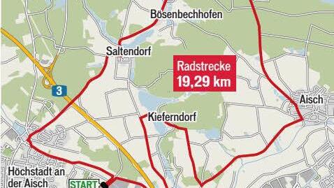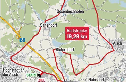 siehe Grafiken). Geradelt wird diesmal über Etzelskirchen Richtung Bösenbechhofen, Aisch, Kieferndorf, Medbach und zurück zum Freibad. Die Laufstrecke verläuft ausgehend vom Freibad Richtung Innenstadt, durch die Siedlung T.-Riemenschneiderstraße, Richard-Strauß-Straße, Franz-Liszt-Straße, Am Sportpark zurück zum Freibad.