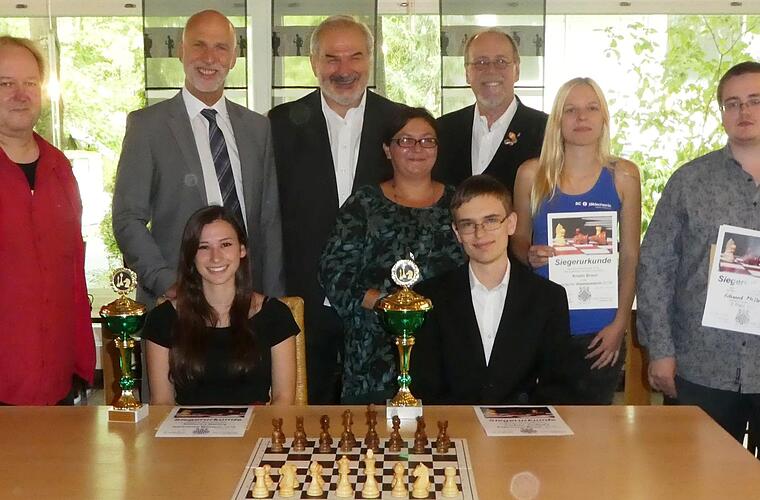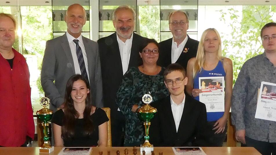 v.l.n.r.: Reiner Heimrath (2.), Katharina Mehling (Frauen 1.), Barbara Niedermaier (Frauen 3.), Lukas Schulz (1.), Kristin Braun (2.) und Eduard Miller (3.) sowie hinten Mitte drei Schachfunktionäre.