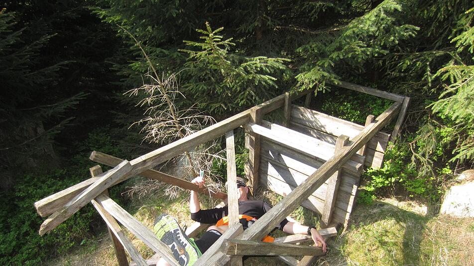 Mit der Familie fahre ich nach Bischofsgrün. Die Läuferfrau Gudrun und mein Sohn Jonas sind mit von der Partie. Der Wanderparkplatz am Ende der Ochsenkopfstraße ist unser Start und Ziel für eine Zehn-Kilometer-Runde. Es ist ein herrlicher Lauftag mit blauem Himmel und angenehmen Temperaturen. Vogelgezwitscher begleitet uns auf dem Weg zur Quelle. Trotz des schönen Wetters haben wir die Wege für uns allein. Nach rund 40 Minuten erreichen wir die Weißmainquelle am Osthang des Ochsenkopfes. Das Fotoshooting ist obligatorisch. Seit 1717 ist die Quelle in Granitblöcken gefasst und trägt das Hohenzollern-Wappen. Weiter geht es runter nach Karches. Wir stärken uns im Waldrasthaus am Karchessee. Von dort laufen wir zurück zum Auto.