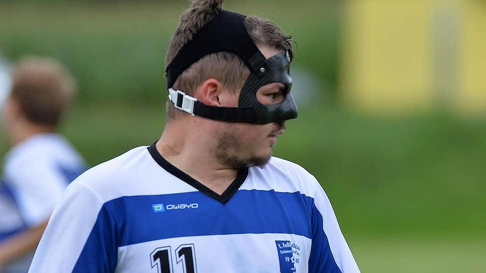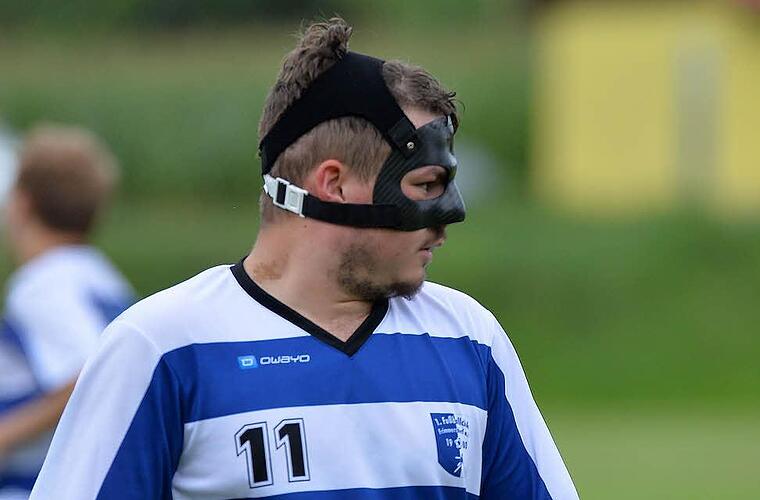 Trotz Einschränkung des Sichtfelds aufgrund einer Maske hat Fabian Schöbel vier Tore erzielt und seinen FC Frimmersdorf an die Tabellenspitze geballert.