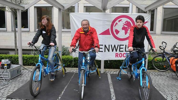 Das besondere an der Beschallung im Schlosshof war an diesem Tag, dass der Strom über drei Fahrräder produziert wurde, auf denen jeder, der Lust hatte, für die Umwelt bzw. für den Strombedarf des Podiums radeln konnte.