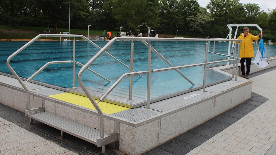 Neu ist auch der Behindertenlift neben der Gewöhnungstreppe. Damit können beispielsweise Rollstuhlfahrer ins Wasser gelassen werden. Sie müssen sich nur an den Schwimmmeister wenden, der die Technik dann bedient.