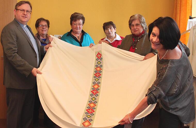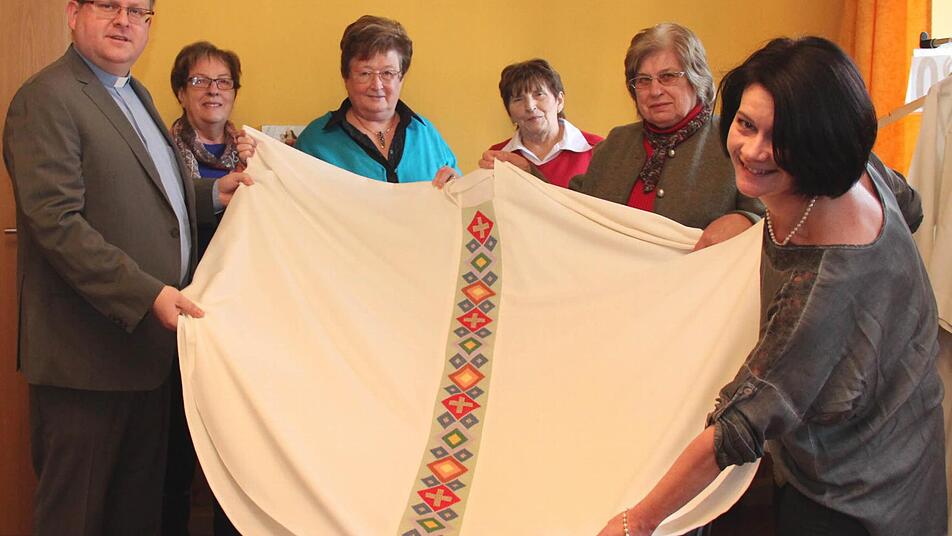 Das neue Priestergewand ist mit Paramentenstickerei verziert. Der Name Parament kommt aus dem Lateinischen und heißt entweder "den Tisch bereiten" oder "den Geist bereiten". Auf diese Art entstehen nur Textilien, die in der Kirche und Liturgie verwendet werden. Die Stickerinnen sind durch einen Bericht im Heinrichsblatt auf die Paramentenstickerei gestoßen. Leute, die an dieser Technik interessiert seien, sollten sich damals zu einem Kurs melden. "Ein Mal waren wir in Bamberg am Jakobsberg, haben dann gleich den Schnitt gemacht und die Muster für die Paramentenstickerei haben wir uns einfach gemerkt", berichtet Inge Rehäußer stolz.