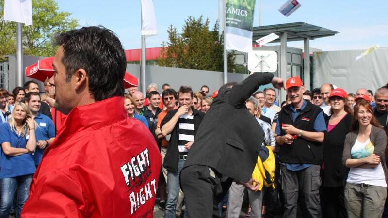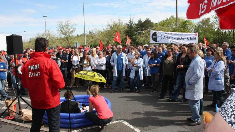 Auch die verteilte "Streikwurst" hilft nur gegen den Hunger, nicht gegen die Wut im Bauch. Es wird immer enger, die Blaumänner und -frauen rücken näher. Wirklich wütend sind die versammelten Arbeitnehmer aber auch noch auf den zweiten Blick. "52 Milliarden Euro", beziffert Heid Donnerstagnachmittag die Bruttogewinne der Branche letztes Jahr.