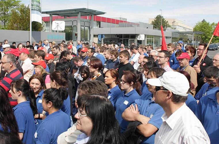 Dicht an dicht stehen die Menschen beim Warnstreik auf dem Buswendeplatz an der Frauenauracher Straße 80 in Erlangen. Sie sind aus den Werkstoren hinter dem Parkplatz zum Warnstreik geströmt, sie arbeiten für die Mutter Siemens. F80 und Siemens G stehen bei diesem Warnstreik aber nicht allein auf dem schwarzen Asphalt vor dem Unternehmen.