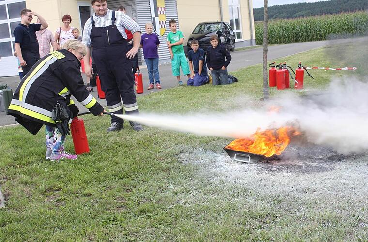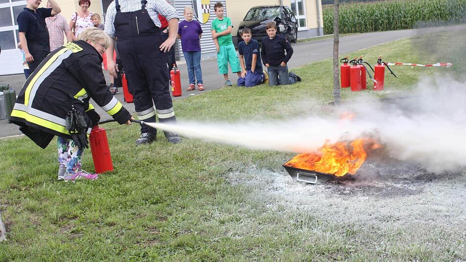Selbst betätigen konnten sich die Besucher beim Löschen eines Demonstrationsbrandes - unter allen Sicherheitsvorkehrungen natürlich. "Jeder hat einen Feuerlöscher zuhause" so Kraft. "Doch hat ihn schon mal jemand ausprobiert und abgedrückt? Hier kann man das mal testen." Mit handelsüblichen Feuerlöschern also rückten die Mutigen einem Flüssigkeitsbrand zu Leibe - mit Erfolg.