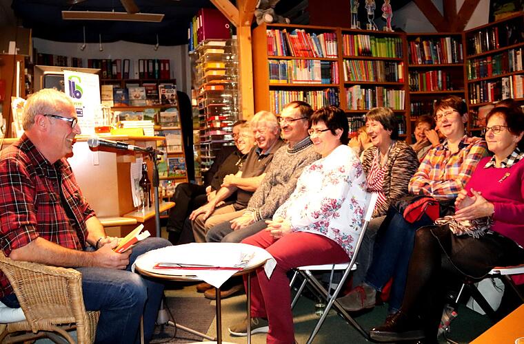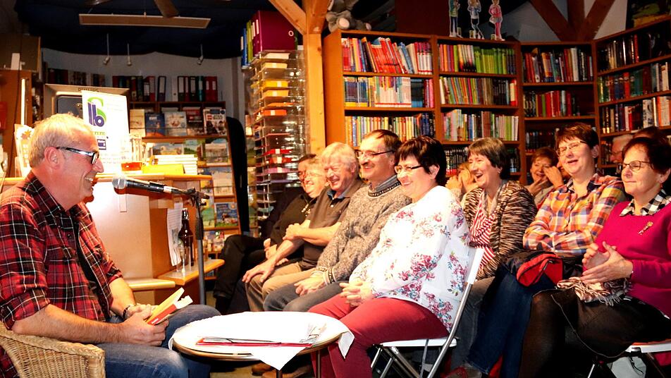 Der kleine Buchladen war voll besetzt, und nach der Begrüßung durch Christian Schmidt übernahm Tommie Goerz das Wort: "Legere - Lesung gegen rechts heißt: Wir machen uns einen ganz entspannten, lockeren, legeren Abend, ich lese aus meine Krimis und erzähle ein paar Geschichten und Anekdoten aus dem Fränkischen."
