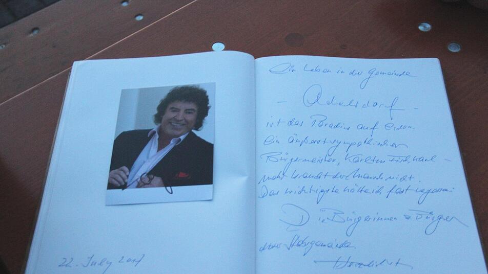 Tony Marshall fuhr mit seinem Sohn am Samstagabend pünktlich am Zelt vor. Bürgermeister Karsten Fischkal (FW) begrüßte ihn. Der weit über die Grenzen Deutschlands bekannte - und besonders bei der älteren Generation beliebte - Sänger schrieb sich anschließend hinter der Bühne ins Goldene Buch der Gemeinde ein.