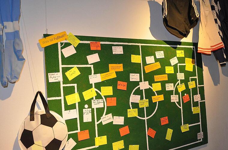 Die Antworten füllen nach und nach die fußballrasengrüne Pinnwand im Eingangsbereich der Sonderschau. "Spielfreude, Kameradschaft und Leidenschaft" sind die Begriffe, die am häufigsten auf der Pinnwand zu lesen sind.