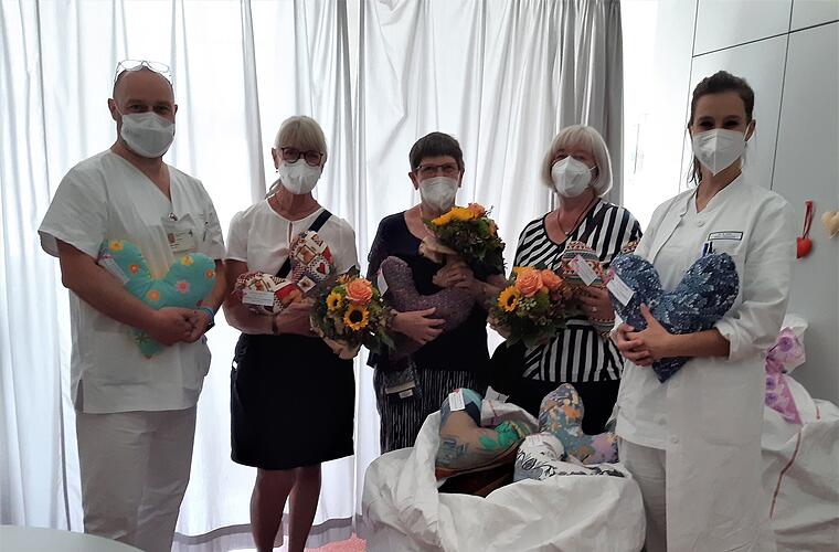 Um diese zu lindern, hälfen Kissen in Herzform, die zur Entlastung des Arms unter die Achsel geklemmt würden. Drei große Säcke gefüllt mit insgesamt 150 dieser selbst genähten Herzkissen übergaben demnach nun Doris Wienke, Uta Luckas und Waltraud Frohring, ehrenamtliche Näherinnen der Herzkissen-Aktion Herzogenaurach, an Dr. Anna Lisa Zahn, stv. Oberärztin der Frauenklinik (Direktor: Prof. Dr. Matthias W. Beckmann) des Universitätsklinikums Erlangen, und Physiotherapeut Mario Witter.