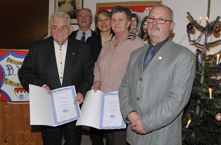 Ihre Urkunde holten sich Karl Ramming (30 Jahre) und Gunda Erhardt (zehn Jahre) persönlich ab. Die Niederndorfer freuten sich besonders, dass Ramming gekommen war. "Ich wohne in Erlangen und bin eigentlich durch meine vielen Bekannten in Niederndorf zu diesem Ortsverband gekommen", erklärte er. Für Ramming gab es nie einen Grund, weshalb er den Ortsverband wechseln sollte. Auch heute ist er gerne bei den Terminen des Ortsverbandes dabei.