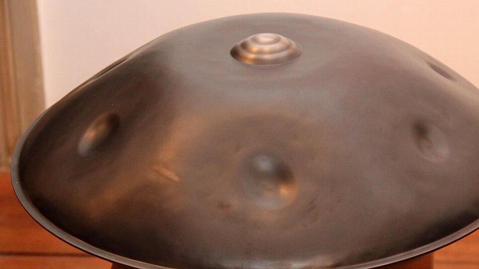 Alexander Linz, Künstler und Musiker, auf dem Freien Integralen Hang, einer Blechklang-skulptur aus der Schweiz. "Im Februar 2013 entdeckte ich dieses Instrument und hab mich gleich verliebt", erzählte der Künstler. Seit 2004 beschäftigt er sich intensiver mit Fotografie und Grafik. Seine ausgestellten Fotografien zeigen Arbeiten zu den Themen Wasser, Natur sowie experimentelle Fotografie. Außerdem präsentiert er einige Arbeiten und Schnitzereien aus Holz.