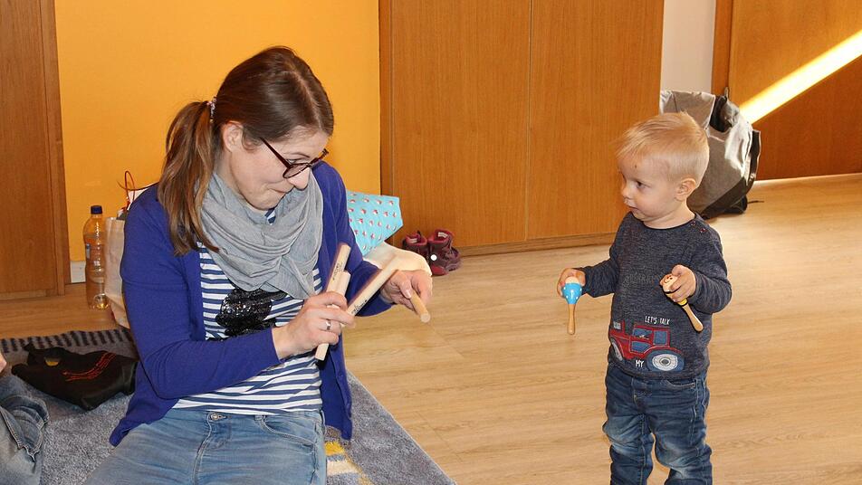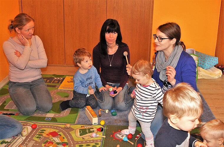 Bei den "Wachenrother Landbabys" ist an diesem Vormittag musikalische Früherziehung angesagt. Bis zu zehn Mütter mit Kindern besuchen nach den Worten von Sindy Brantz jeweils die Krabbelgruppe. Die Familienkinderkrankenschwester aus Wachenroth leitet und organisiert die Eltern-Kind-Gruppe, die sich zweimal im Monat im Pfarrheim trifft.