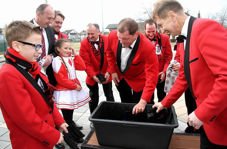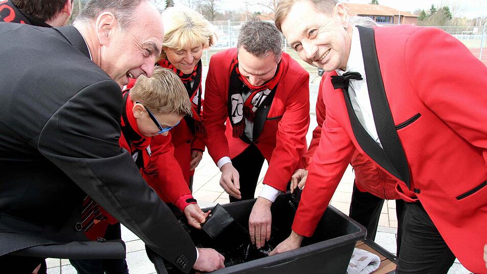 Vorsorglich hatte Hausmeister Dieter Ebersbergen warmes Wasser für das Waschen der leeren Geldbeutel bereitgestellt. Der Elferrat der Blummazupfer und der Bürgermeister ließen sich nicht zweimal bittet und taten dies ausgiebig. Ob's hilft?