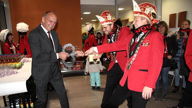 Nach dem Schlüssel mussten die Narren nicht suchen, den hatte der Bürgermeister in der Hand: Und das gute Stück wurde von den hereindrängelnden "Blummazupfern" auf Anhieb überhaupt nicht bemerkt. Präsident Matthias Petsch versuchte schließlich, dem Gemeindeoberhaupt den Schlüssel zu entreißen und wurde vom Vizepräsident Daniel Weiß unterstützt. Nach einem kurzen Gerangel reckte der Präsident den Schlüssel in die Höhe.