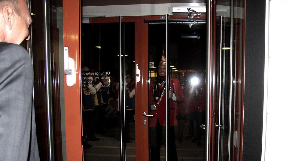 Endlich spiegelte sich in den Fenstern der Schule das Blaulicht des begleitenden Feuerwehrautos und die Trommelschläge des Spielmannszuges waren zu hören. Ein kurzes Rütteln der Präsidenten und der Bürgermeister ließ die närrische Truppe ins Rathaus.