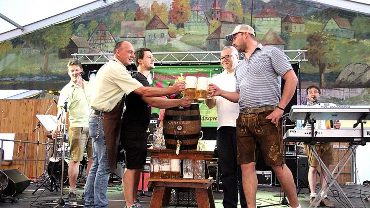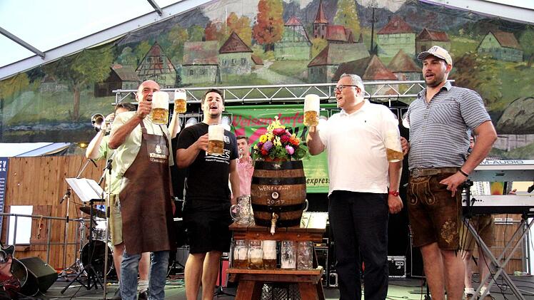 Zusammen mit Brauereichef Peter Kitzmann, Festwirt Bernd Schuhmann und dem Ortsoberburschen Kevin Schneider stieß der Bürgermeister ein weiteres Mal auf die nächsten Tage an.