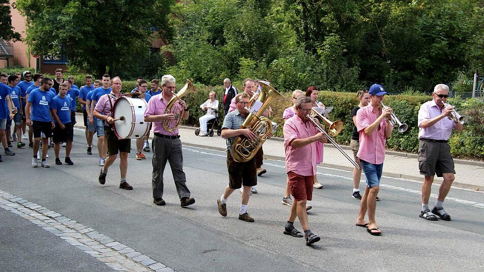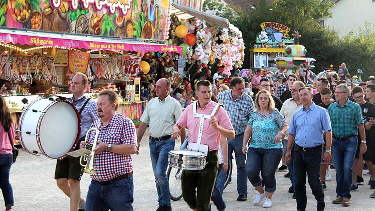 Süß stieß mit Landrat Alexander Tritthart (CSU) und den Ortburschen auf eine ruhige und schöne Kerwa an. Die Ortsburschen schmetterten dazu ihre traditionellen Kerwalieder. Nach dem Standkonzert des Posaunenchores unter der Leitung von Dieter Schmerler formierten sich die Freibiertrinker und zogen mit Musik zum Festplatz.