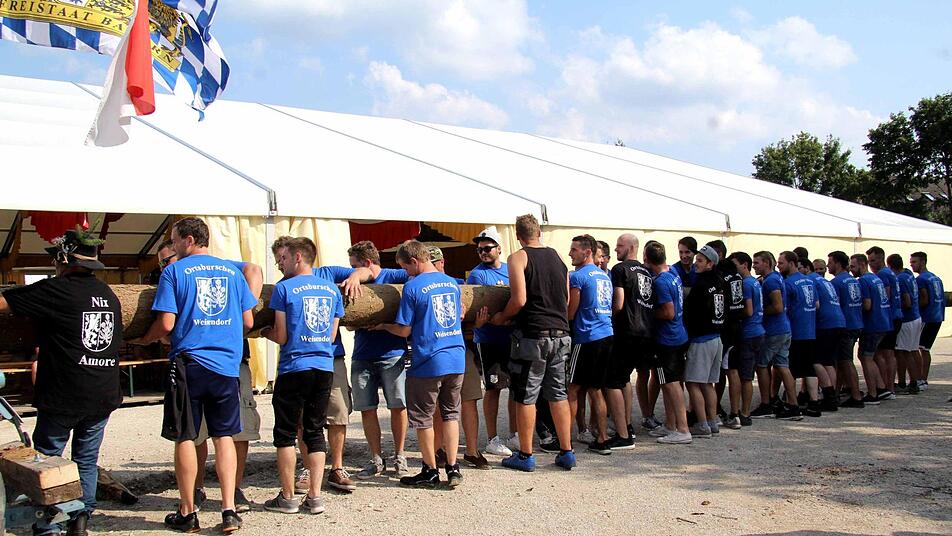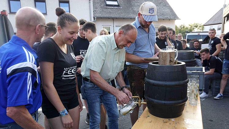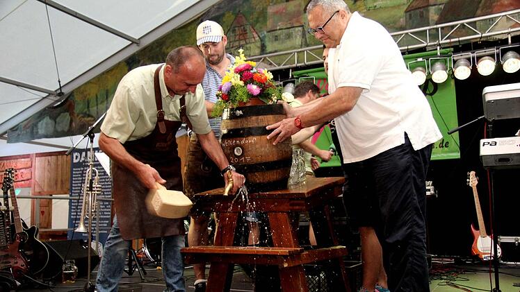 Traditionell werden bei der Weisendorfer Kerwa offiziell zwei Fässer angestochen. So treffen sich Ortsburschen und die Vereine auf dem Marktplatz. Auch in diesem Jahr spendierten die Brauerei Kitzmann und der neue Festwirt Bernd Schuhmann wieder 60 Liter Freibier.