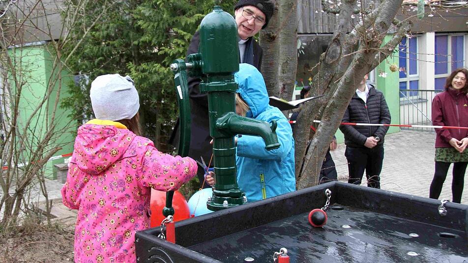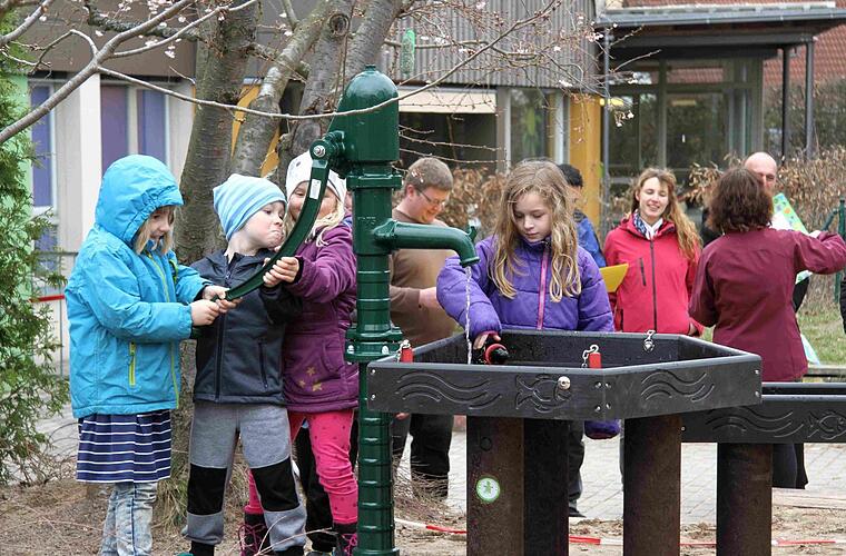 Die neue Anlage, die aus einer Wasserpumpe und stufenweisen Wasserbecken sowie einem kleinen Wasserrad besteht, bilde einen wichtigen Natur-Erlebnisraum für Kinder. "Jetzt dürft ihr euch so richtig dreckig machen, ohne dass ihr geschimpft werdet", sagte Pfarrer Wilfried Lechner-Schmidt schmunzelnd bei der kleinen Einweihungsfeier.