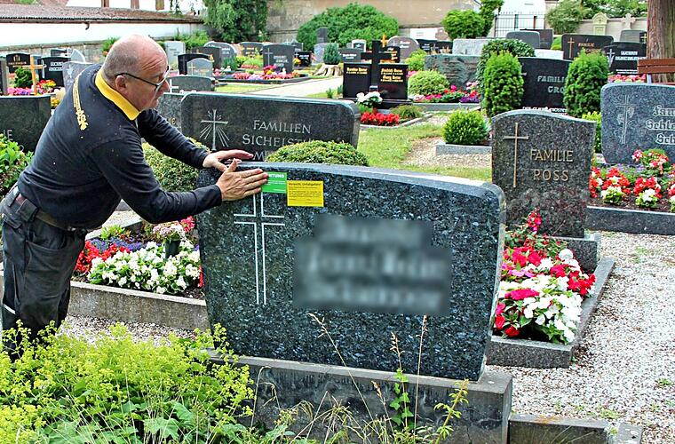 Fällt ein zentnerschwerer Grabstein um, kann das böse ausgehen. Darum müssen die Male auf ihre Standfestigkeit überprüft werden. So wie in Uehlfeld.