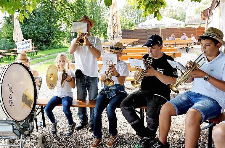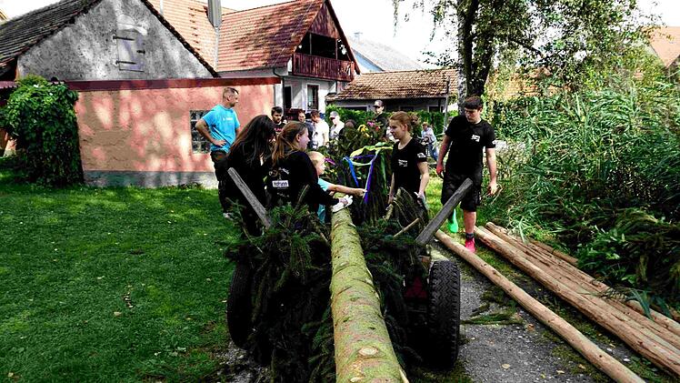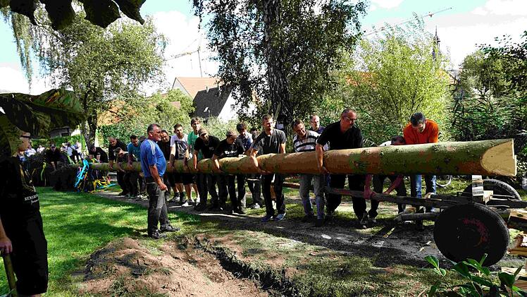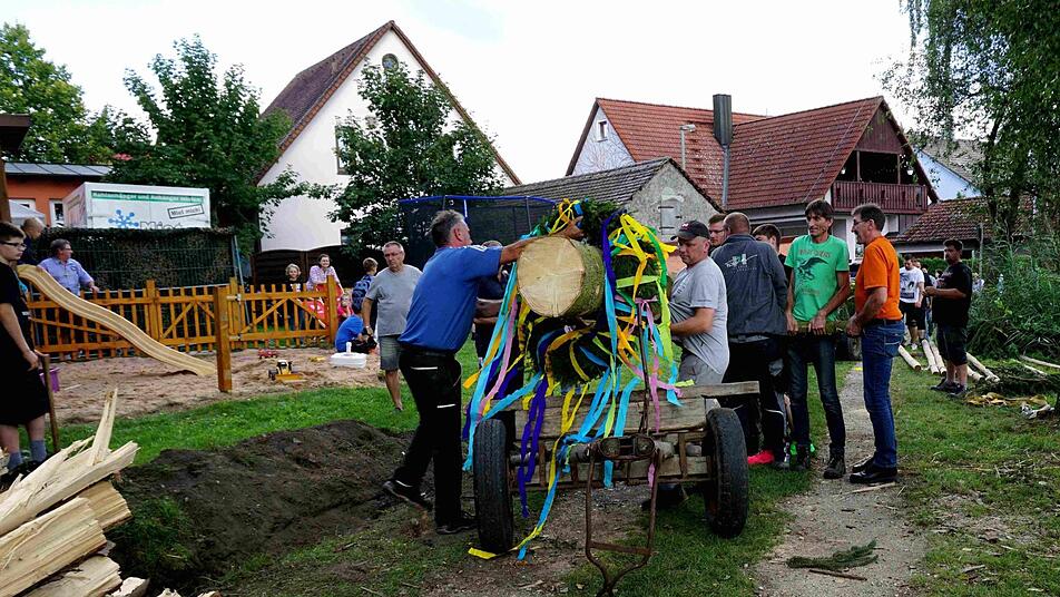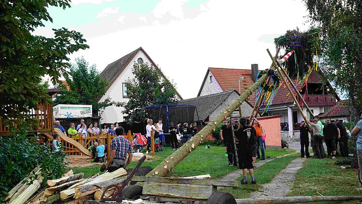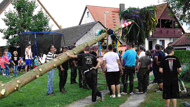 Begonnen hatte die Kerwa schon am Donnerstag mit der obligatorischen Schlachtschüssel, also Kesselfleisch sowie Blut- und Leberwürsten. Am Samstag bereiteten sich die Ortsburschen auf das Aufstellen des Baumes vor und der wurde dann auch unter dem bewährten Kommando des "Baum-Capos" Werner Weber und mit Unterstützung von ehemaligen Ortsburschen in die Senkrechte gebracht. "Jetzt macht die Weiherseit'n an Ruck und noch a mol an klaana Schub", dirigierte Weber die Männer und ließ dann die "Werdshausseit'n" wieder schieben. Die Ortsburschen und die "Kalindiä Kerwa-Musikantn" hatten sich am Ende den Beifall der zahlreichen Zuschauer im Biergarten dann auch redlich verdient.