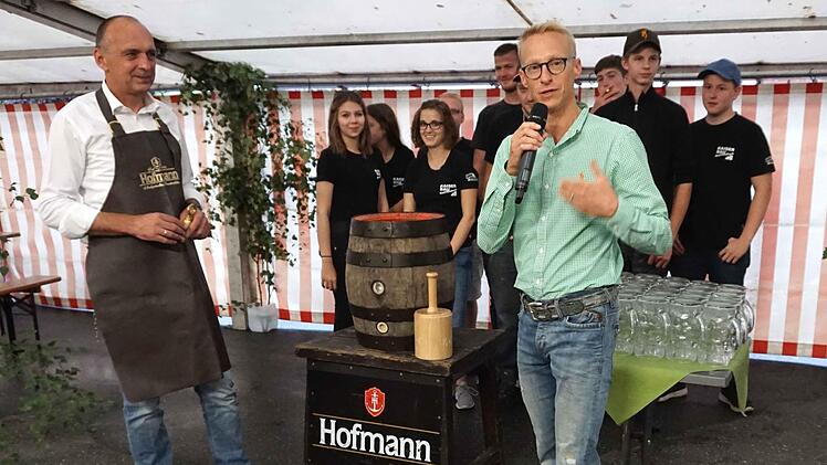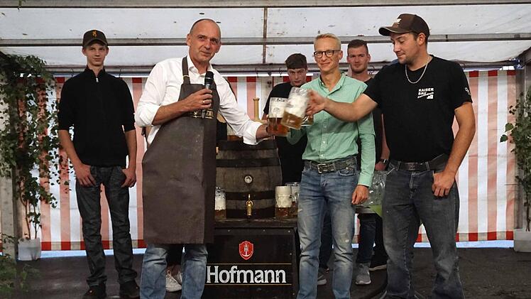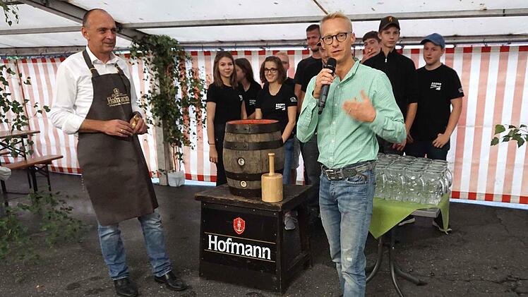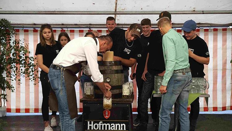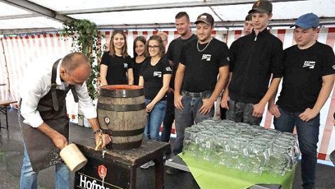 Es war ein Auftakt nach Maß bei der Kairlindacher Kirchweih im Festzelt des Gasthauses "Alte Schule" im Weisendorf Ortsteil. Mit einem Schlag trieb Bürgermeister Heinrich Süß den Hahn in das von der Brauerei Hofmann gestiftete Fass Freibier und stieß mit Oliver Brehm sowie den Ortsburschen und Madla an. Zuvor begrüßte Oliver Brehm die Kirchweihgäste und versprach eine unterhaltsame und kulinarische Kerwa im Festzelt und dem großen idyllischen Biergarten am Kirchweiher.
