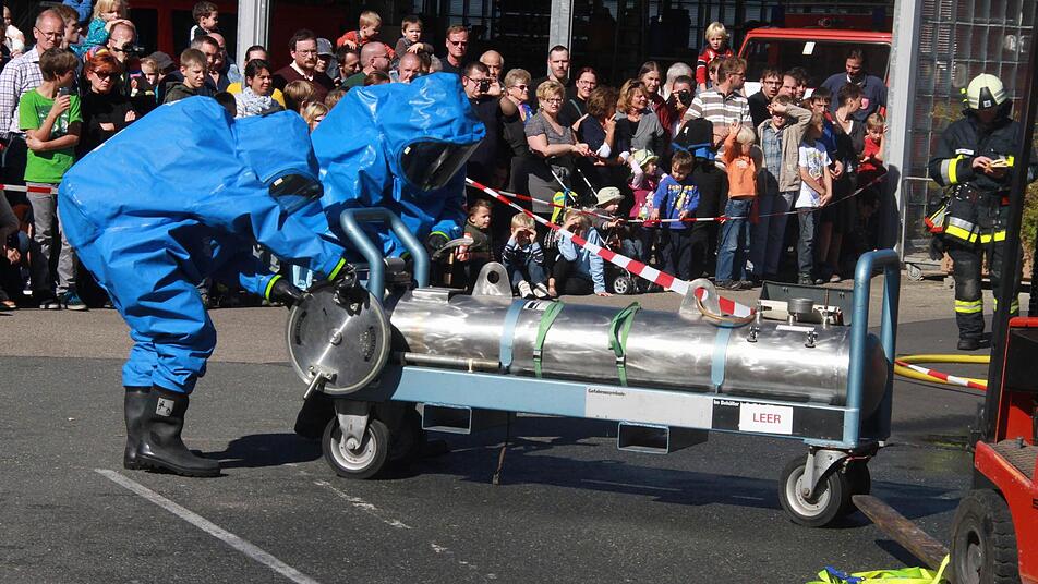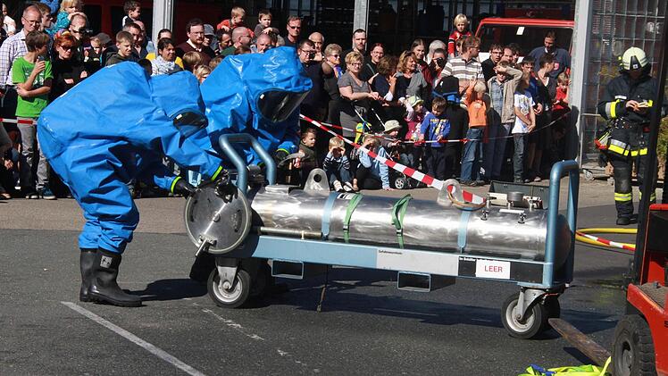 Doch wer an der Feuerwehr interessiert war, erlebte einen spannenden Tag. Denn tatsächlich: mit Spezialausrüstung wurde demonstriert, was eine Werksfeuerwehr so alles zu bewältigen hat. So galt es eine defekte Ammoniakflasche zu bergen. Vom Moderator beschrieben, schienen die Besucher das stark stechende und riechende, aber farblose giftige Gas förmlich zu riechen. Natürlich strömte das Gas, das zu Tränen reizt und erstickend wirkt nicht wirklich aus, aber alles schien sehr echt. In Spezialanzügen wurde die Flasche gesichert und in einem ebenfalls speziellen Behälter abtransportiert.