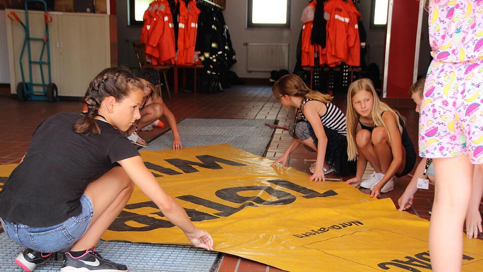 Mit Beispielen aus dem täglichen Schulalltag macht Helwig den eigentlich unsichtbaren toten Winkel konkret. Gemeinsam legen die Kinder im Feuerwehrhaus mithilfe einer Schnur und eines Blicks in den Fahrzeugspiegel die Fläche des toten Winkels mit einer Folie aus. Fast die gesamte linke Seite des Einsatzwagens, der als Beispielauto gelten soll, ist plötzlich abgedeckt.