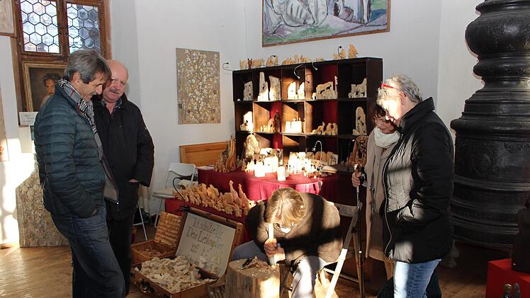 Im Saal der Orangerie konnten die Besucher einem Holzschnitzer bei der Herstellung von kleinen Tieren oder Engeln zuschauen. Daneben wurde dekorativer Silberschmuck angeboten. Massivholzmöbel, Skulpturen, Hüte, Lederwaren Alpakawolle und dazu die lebenden Tiere als Wolllieferanten zogen die Besucher an.