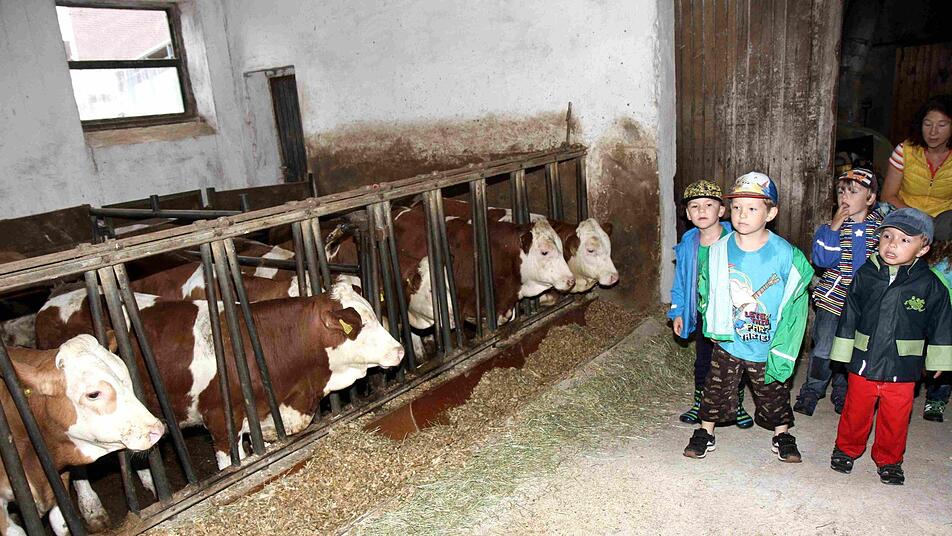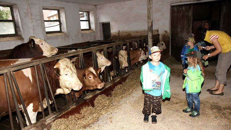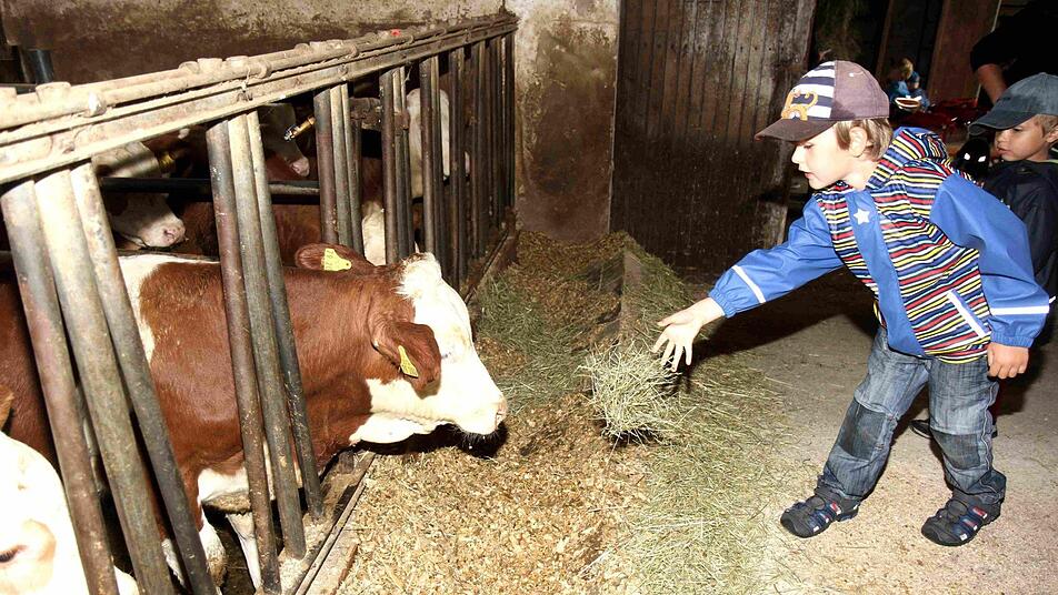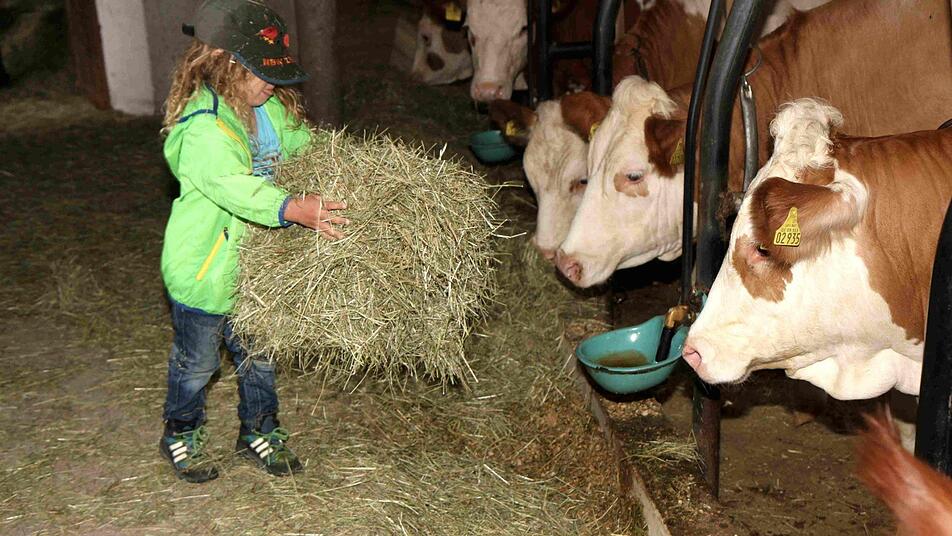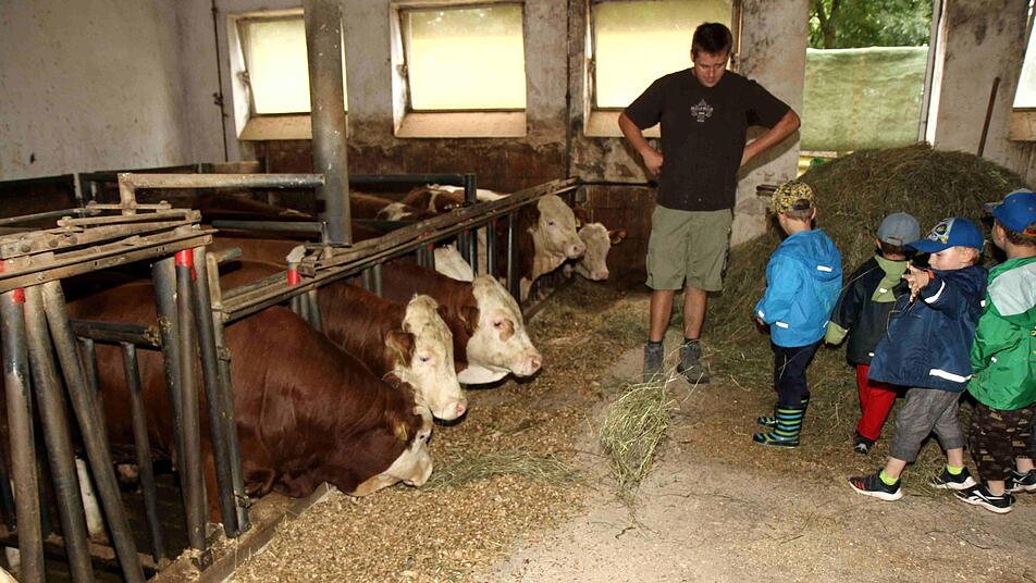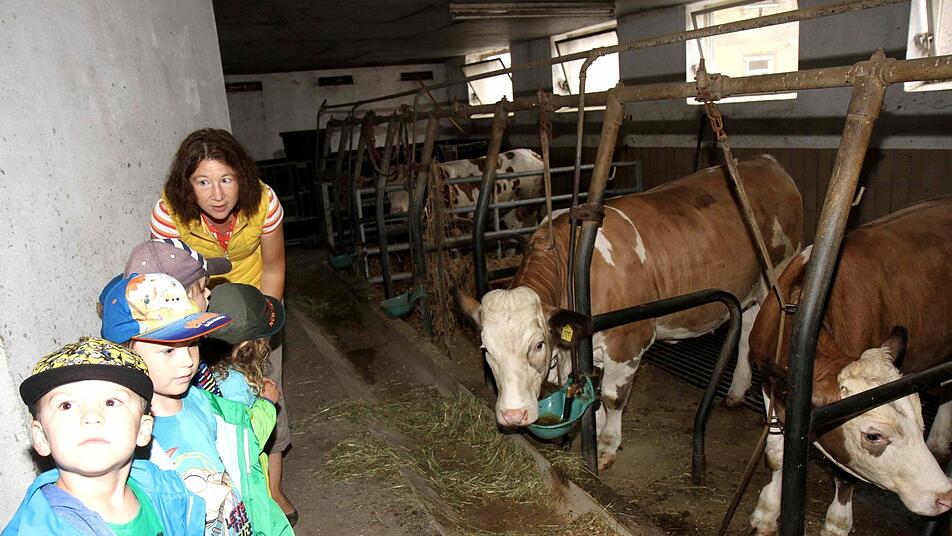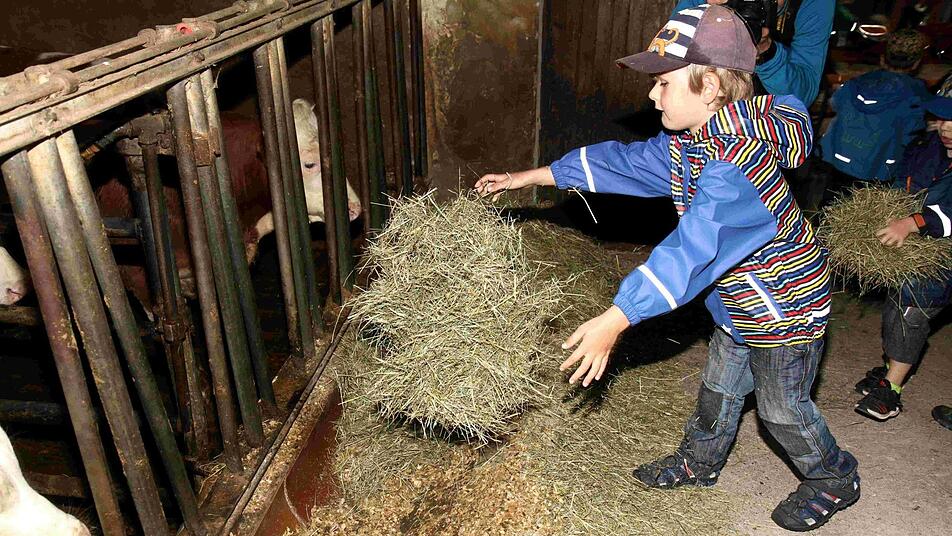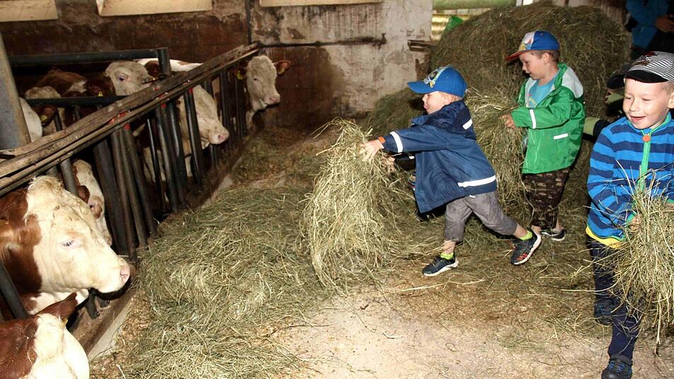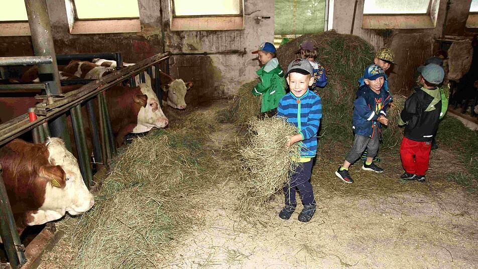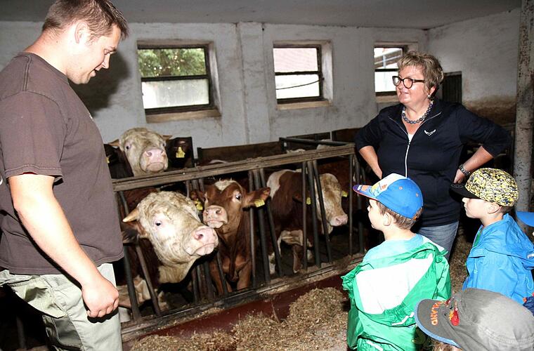 "Viele Kinder hören und sehen zum ersten Mal, woher Milch und Eier kommen", sagte die Kreisbäuerin, als die Kinder die Hühner füttern durften. Aber auch die über 70 Tiere in drei Ställen, weibliche und männliche Jungtiere sowie Mastbullen, konnten die Kinder mit duftendem Heu versorgen. "Da dürft ihr ruhig näher rangehen und auch streicheln", ermunterte Jungbauer Florian Grau die respektvoll Abstand haltenden Kinder. Dabei zeigte er ihnen, dass Tiere auch lachen können. "Wenn ich den über die Nase streichle, lacht er sogar", demonstrierte Florian, als der Bulle die Zähne zeigte und dies aussah, als würde er grinsen.