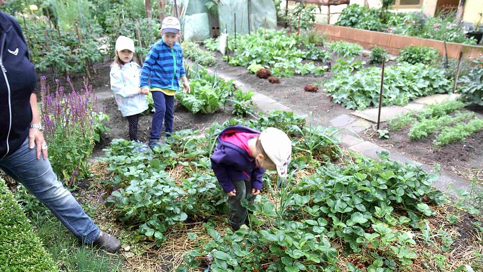 Christa Grau führte die Kinder deshalb durch ihren vielfältigen Gemüsegarten, in dessen Beeten alles wächst, was für ein gesundes Essen gebraucht wird und zum Naschen durften natürlich auch Erdbeeren gepflückt werden.