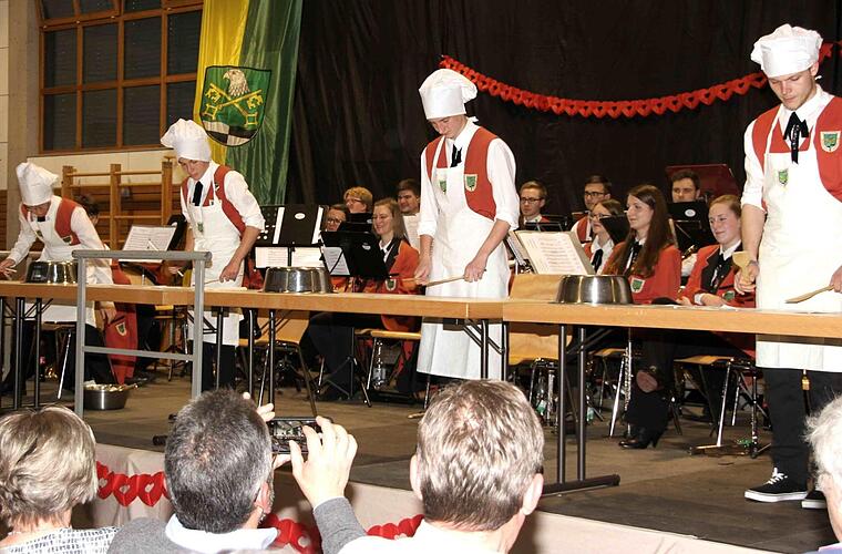 Das große Orchester unter Leitung von Wolfram Heinlein begann dann nach einer kurzen Umbaupause dann kraftvoll mit "Abba Gold" und ließ anschließend bei einem Medley viele bekannte TV-Melodien hören. Auch der Walzer "Gold und Silber" von Franz Lehar und "Moment for Morricone" durften nicht fehlen. Bei "Kleine Tischmusik" nahmen die Schlagzeuger verkleidetet als Köche die erste Reihe ein, aber nicht mit dem Schlagwerk, sondern mit Kochlöffeln. Den Abschluss bildete ein gemeinsamer Auftritt der beiden Orchester, wobei "Baby Elephant Walk" für Begeisterung bei den Besuchern sorgte.