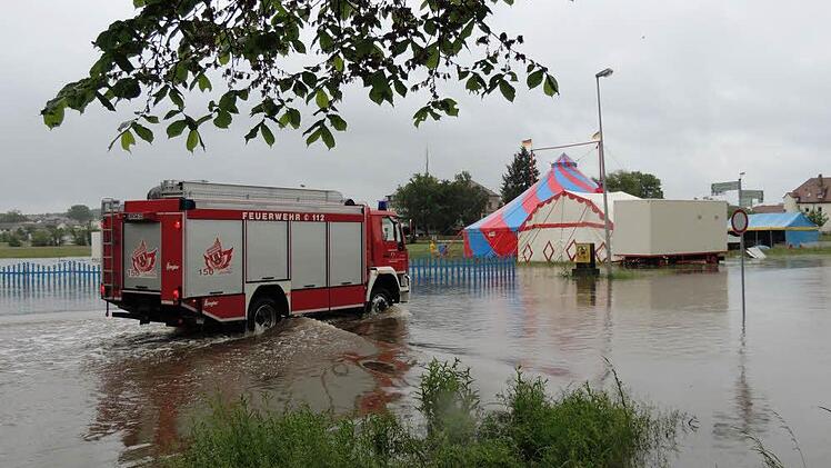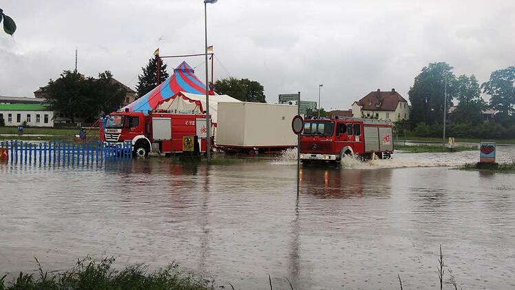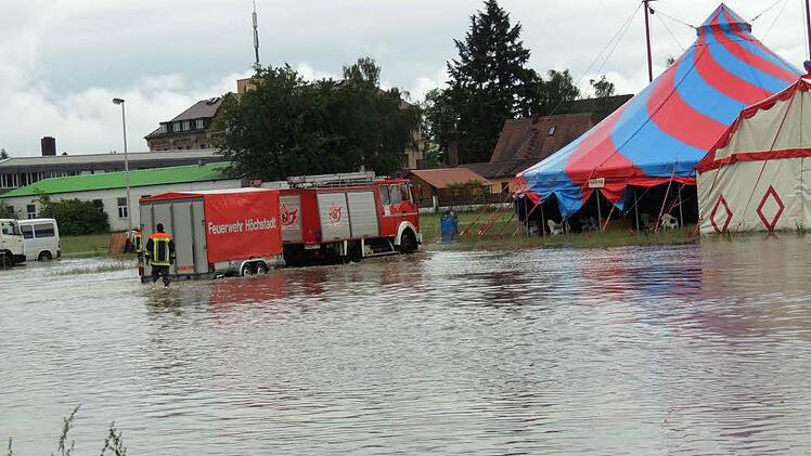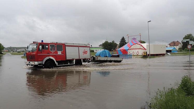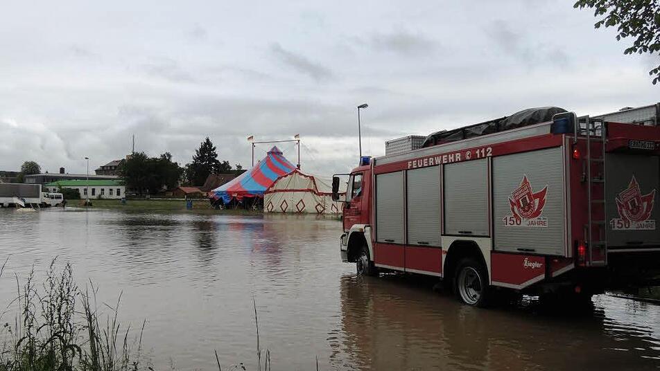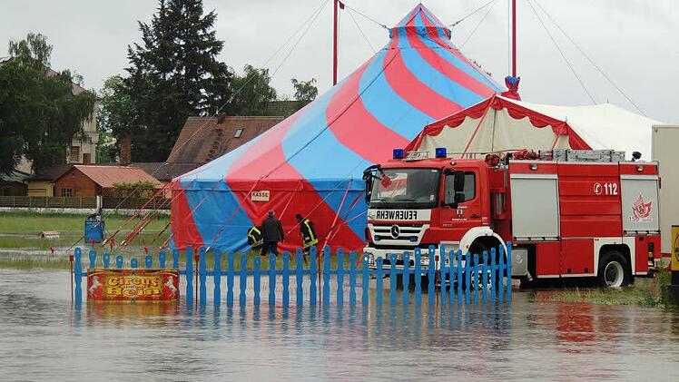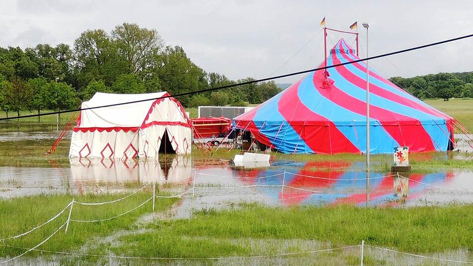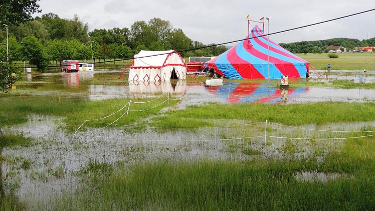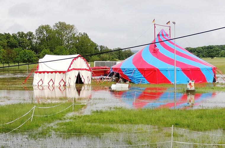 Auf den Höchstadter Aischwiesen steht das Zirkuszelt im Wasser. Tiere und Fahrzeuge des Mitmachzirkus "Klimazi" wurden rechtzeitig in Sicherheit gebracht. Eine Aufführung der Kinder fällt damit buchstäblich ins Wasser.