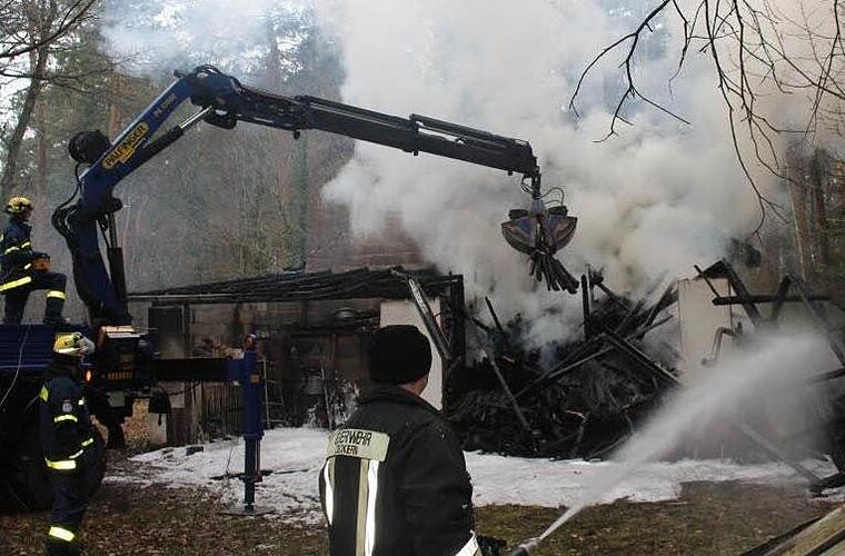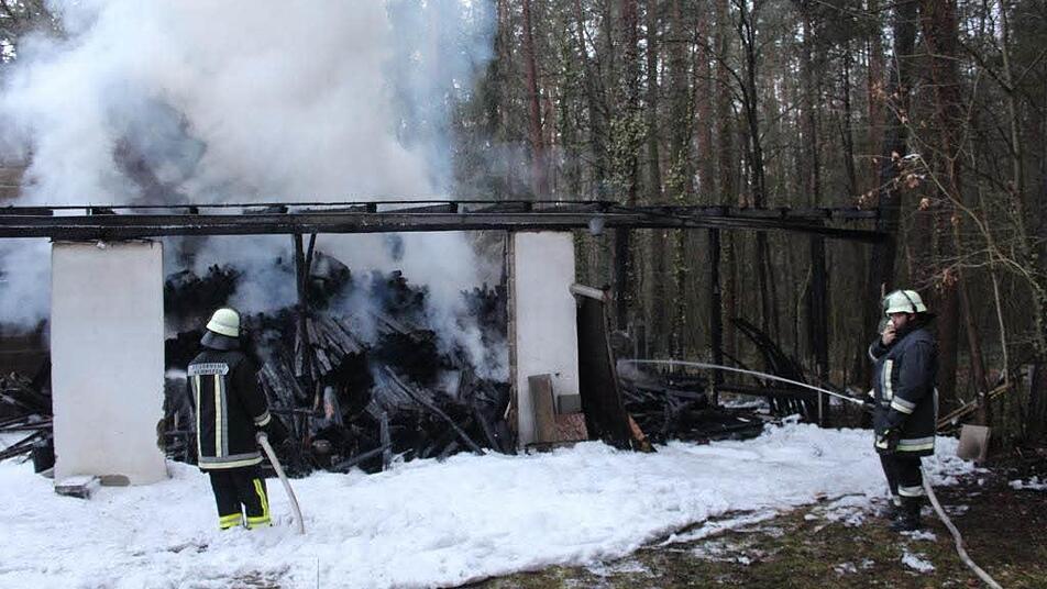 Als die Feuerwehr Zeckern noch mit Aufräumarbeiten beschäftigt war, stellten gegen 4.30 Uhr die Feuerwehrmänner nicht unweit Rauchentwicklung und Feuerschein eines zweiten Brandes fest. Diesmal im Wald in Richtung der Bundesstraße 470, unmittelbar hinter dem Wohngebiet in der Köhlerstraße. Beim Eintreffen der ersten Kräfte in dem nur sehr eingeschränkt zugänglichen Bereich wurde eine im Wald befindliche landwirtschaftliche Maschinenhalle in Vollbrand vorgefunden.