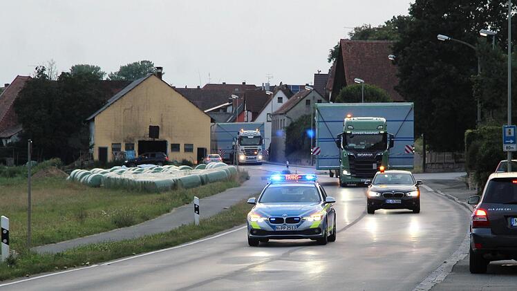 Die nahezu straßenbreiten Transporter ließen keinen Gegenverkehr zu. Dieser wurde von der Polizei an geeigneten Ausweichstellen immer wieder angehalten. Die Ortschaften Neundorf, Münchaurach und Falkendorf waren für die Lkw-Fahrer dabei eine besondere Herausforderung und beim Umfahren der Verkehrsinseln musste zentimetergenau rangiert werden.