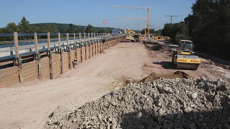Der Grund: Die Brücke wird inklusive Damm mit insgesamt 16 Metern breiter als vorher. "Also brauchen wir auch mehr Material", sagt Jöbstel. Als Vorbereitung für den Lärmschutz wurden hinter den künftigen Leitplanken im Böschungsbereich im Abstand von zwei, drei Metern runde Fundamente mit einem Durchmesser von 90 Zentimetern einbetoniert.
