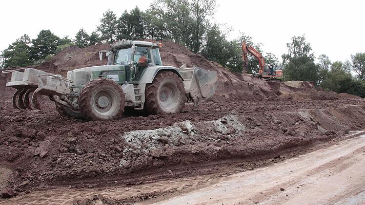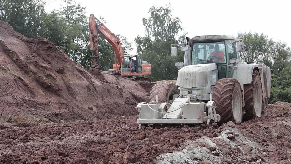 Hier ist ein Großteil der 20 000 Kubikmeter Feuerletten, die bereits als Unterbau der in den 1980er Jahren errichteten alten Brücke gedient hatten und auf einem Feld unweit der Baustelle zwischengelagert waren, wieder verbaut. "Wir haben das Material diesmal mit Kalk und Zement vermischt, um eine höhere Festigkeit zu erreichen", erklärt Reinhold Jöbstel, der darauf verweist, dass dieser Erdaushub, der ursprünglich aus der Deponie Gosberg stammt, vermutlich nicht reichen werde.