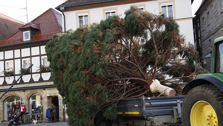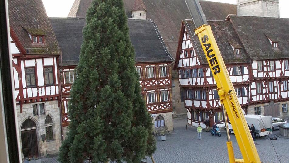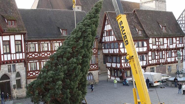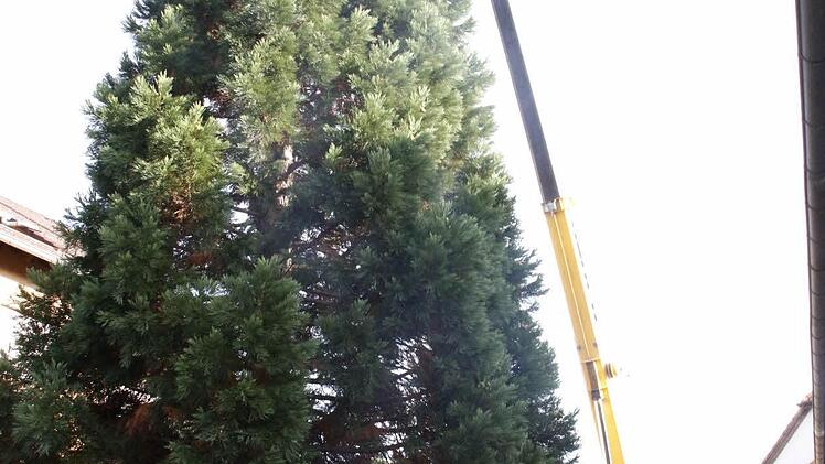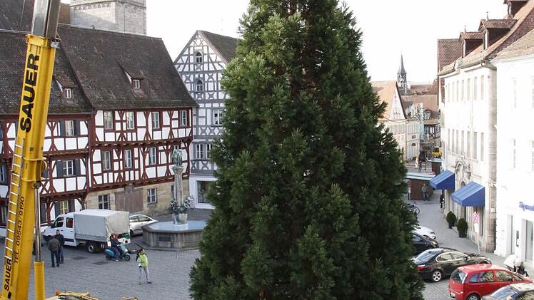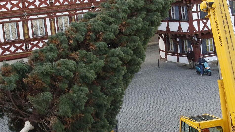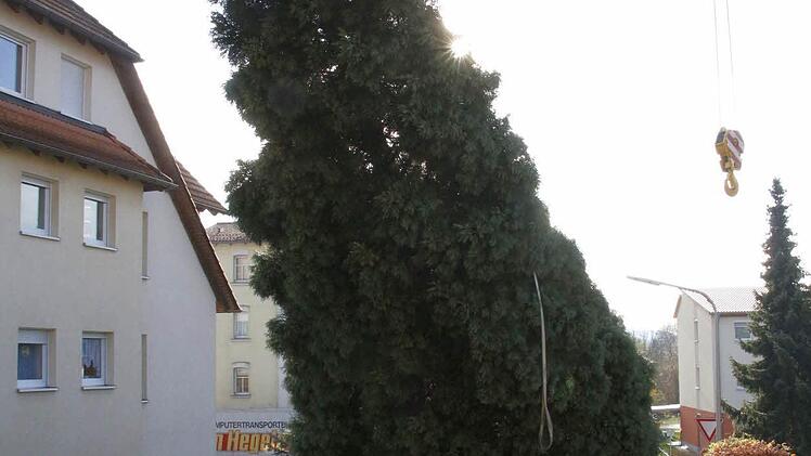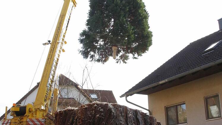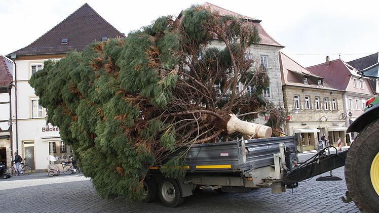 Vier Mitarbeiter des Gartenamtes der Stadt Forchheim holten den 15 Meter hohen und gut 30 Jahre alten Baum aus dem Stadtteil Reuth an den Rathausplatz.