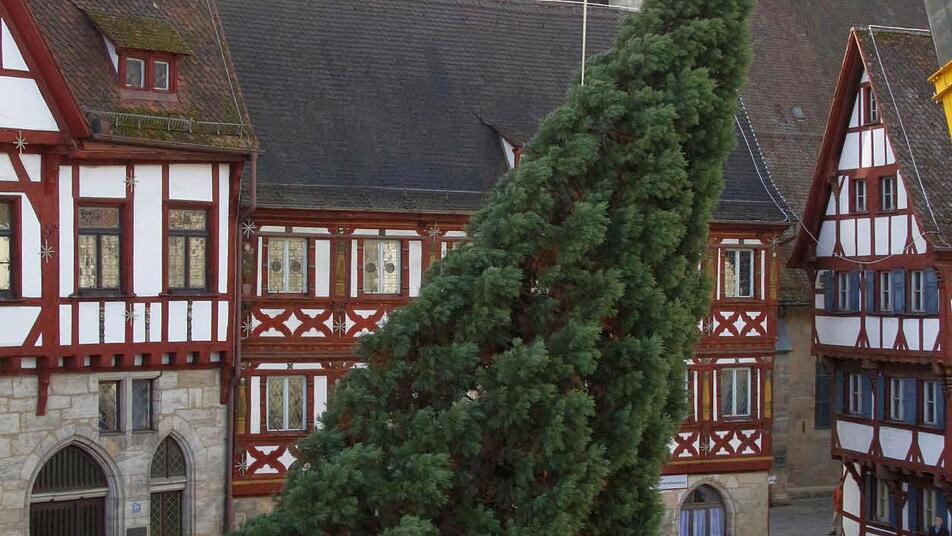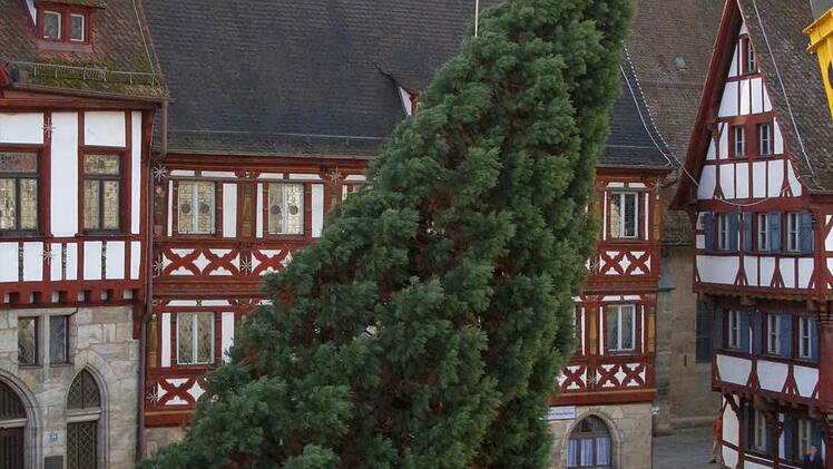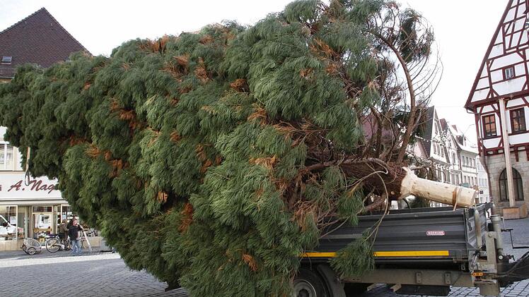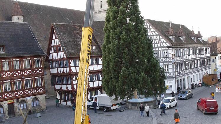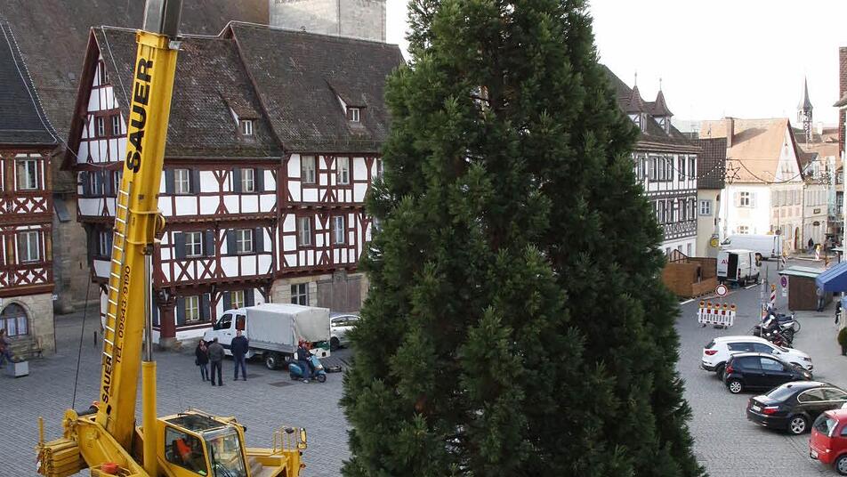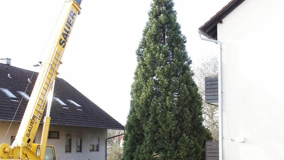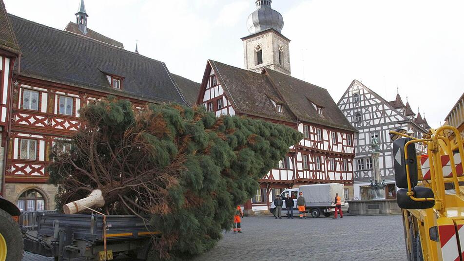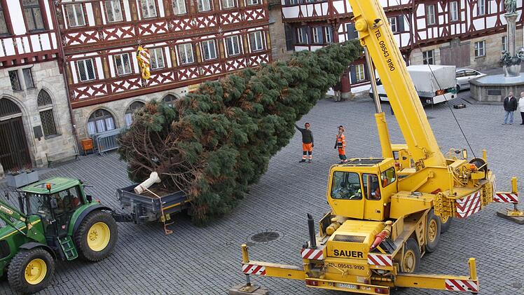 Vier Mitarbeiter des Gartenamtes der Stadt Forchheim holten den 15 Meter hohen und gut 30 Jahre alten Baum aus dem Stadtteil Reuth an den Rathausplatz.