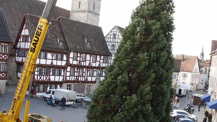 Unter Polizeischutz wurde der Christbaum zum Rathausplatz gebracht und mit Hilfe des Kranes aufgerichtet. Damit der mächtige Stamm in die 33 Zentimeter breite Halterung passt, wurde der Durchmesser von ursprünglich 80 Zentimetern entsprechend reduziert. Dann wurde der Christbaum verkeilt. Ein Metallgerüst, so Andreas Geck vom Stadtgartenamt, gibt dem 15 Meter hohen Baum zusätzlichen Halt.