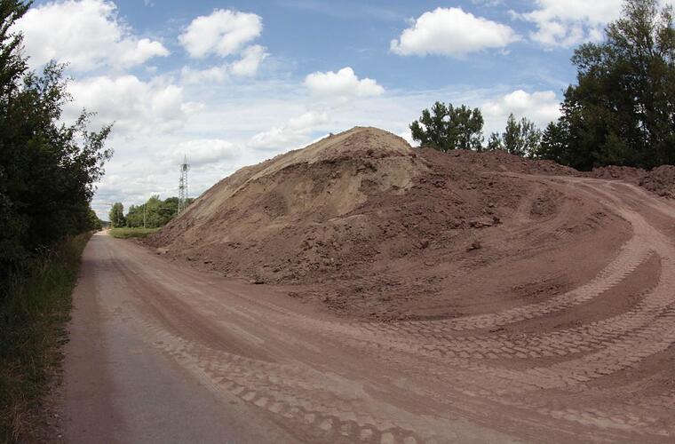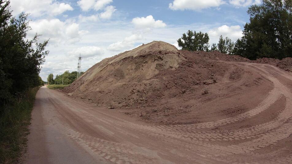 2000 Lkw-Ladungen Erde werden sich neben der A 73 auf Burker Flur zwischengelagert. Die Erde war Teil des Damms vom alten Burker Naturbad. Das Material wird mit Kalk und Zement vermischt, verdichtet und verbaut.
