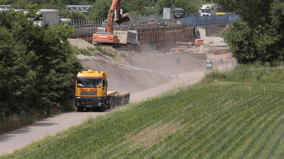 Den am Bau der neuen Autobahnbrücke beteiligten Unternehmen kamen die landwirtschaftlichen Flächen der Burker gelegen: Das Erdreich des Dammes, der abgetragen werden muss, muss nur 200 Meter transportiert werden. Es handle sich dabei um Feuerletten - eine Gesteinseinheit - aus der Deponie Gosberg, der Anfang der 80er-Jahre beim Bau der Autobahn verwendet worden war, erklärt Reinhold Jöbstel von der Autobahndirektion Nordbayern. Auf einer Länge von 200 Metern wird das gesamte Material ausgebaut.