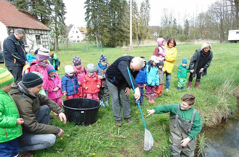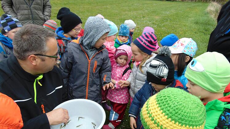 Nicht alle kleinen Besucher hören alles, zu interessant sind die jungen Bachforellen, die von den Kindern in die Hand genommen werden dürfen. "Ich habe meine Hände schon nass gemacht", rufen die Mädchen und Jungen, denn sie sollten aufpassen, dass sie die Fische nur mit nassen Fingern berühren, damit keine Pilze an die Schleimhäute der Fische gelangen.