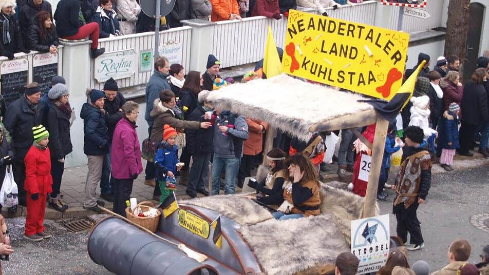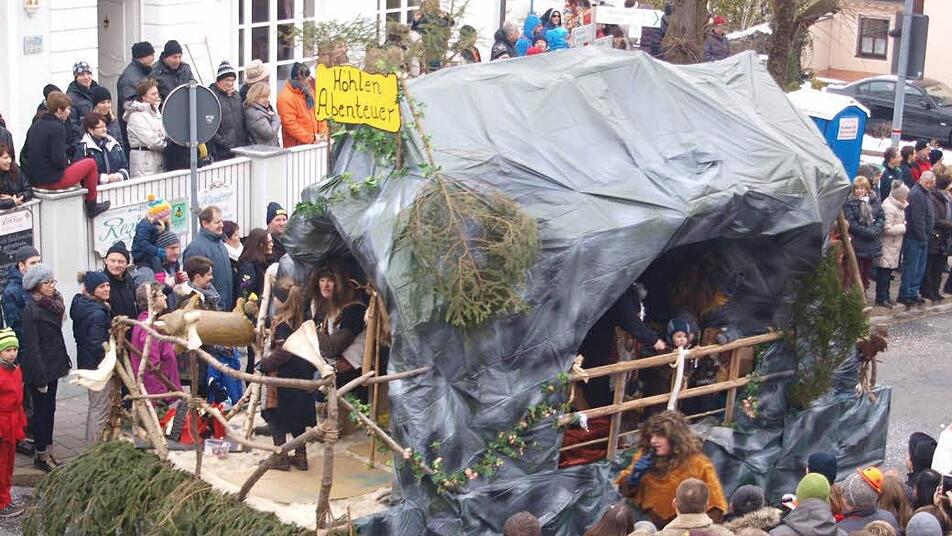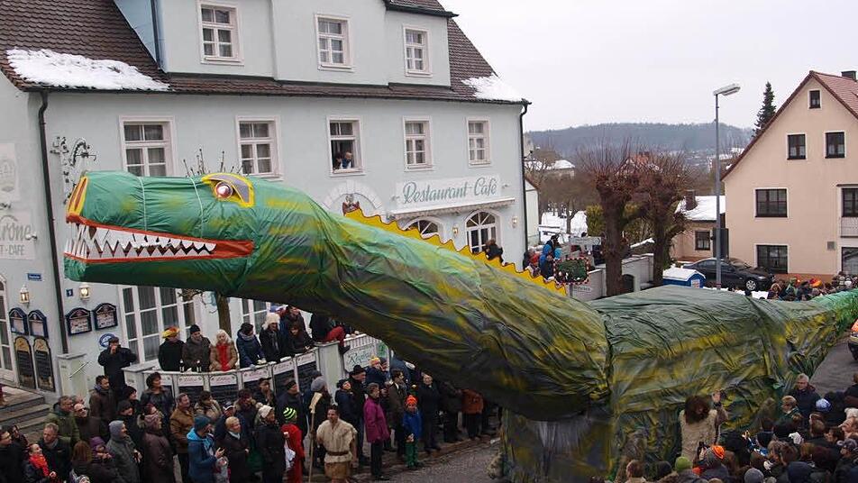 1000 Narren beteiligten sich in Gößweinstein am rekordverdächtigen Umzug. Besonders bestaunt wurde der Dinosaurier, den die "Kohlstaaner Höhlenmenschen aus dem Neandertal" gebaut hatten.