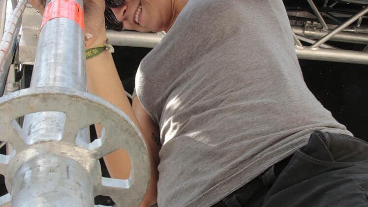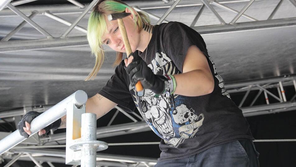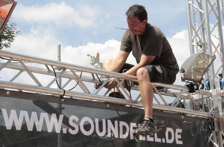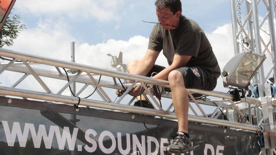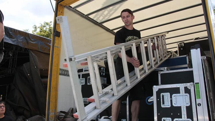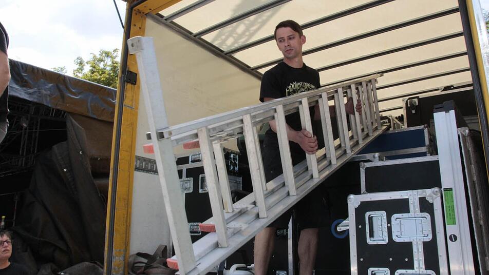 Jetzt muss die Bühnentechnik installiert werden, damit die Bands im wahrsten Sinne im Rampenlicht stehen. Dazu werden Beleuchterstangen und Deckensegel befestigt und jede Menge Kabel verlegt. Kiste um Kiste wird aus einem großen Brummi auf die Bühne gehievt.