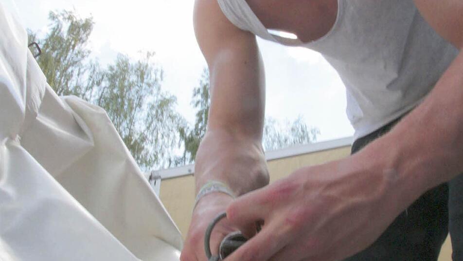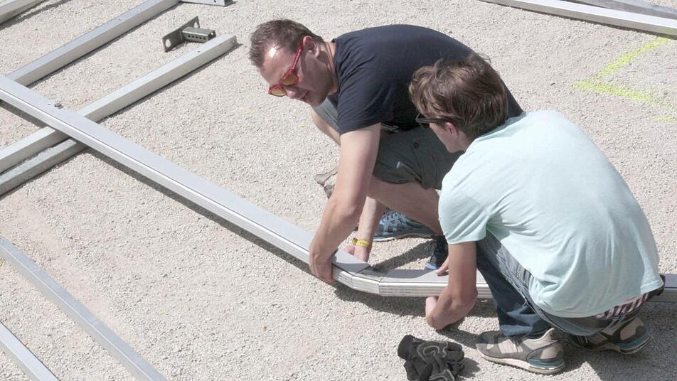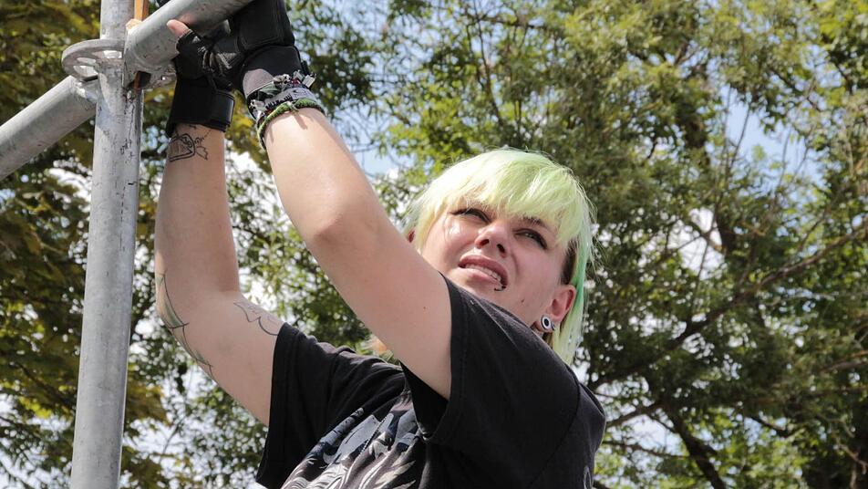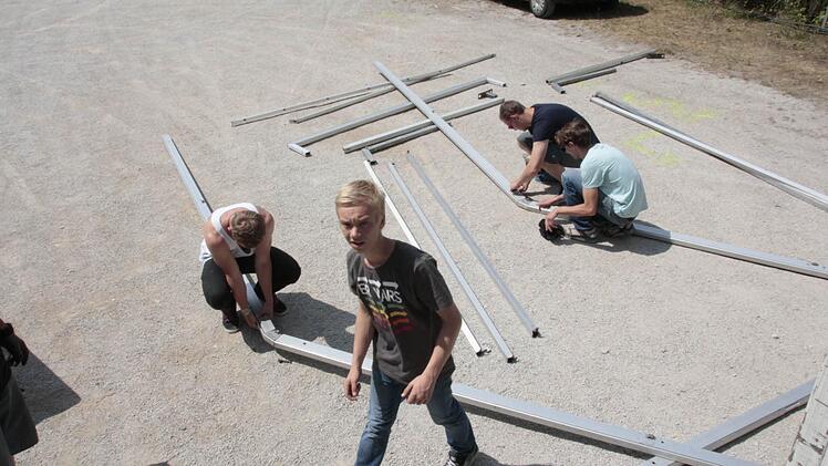 Parallel dazu bauen Jugendliche ein Zelt für den Backstage-Bereich für die insgesamt 16 Bands auf, die am Samstag und Sonntag zu hören sind. Damit das Zelt wetterfest bleibt, wird es mit langen Metallnägeln fest im Boden verankert. Mädchen schleppen Tische und Bänke ins Zelt und zwei Männer bringen zwei große Kühlschränke. Schließlich wird es heiß hergehen...