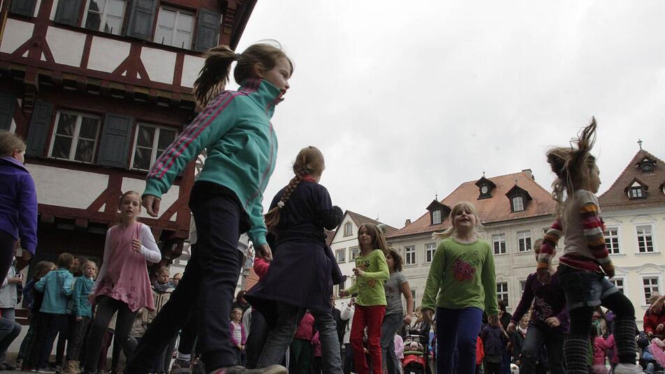 Die ganz Kleinen beginnen mit elementarem Kindertanz wi etwa dem "Lied über mich" von Peter Wackel, alias Steffen Peter Haas aus Bubenreuth. Bei dem Lernlied zeigten die Kinder vollen Körpereinsatz, passend zu dem Text: "Ich hab' Hände mehr als zwei und auch Haare mehr als drei, ich hab einen runden Bauch, und ne Nase hab ich auch, ich hab links und rechts ein Bein, und ein Herz, doch nicht aus Stein,und jetzt winke ich dir zu, hallo du, du, du.